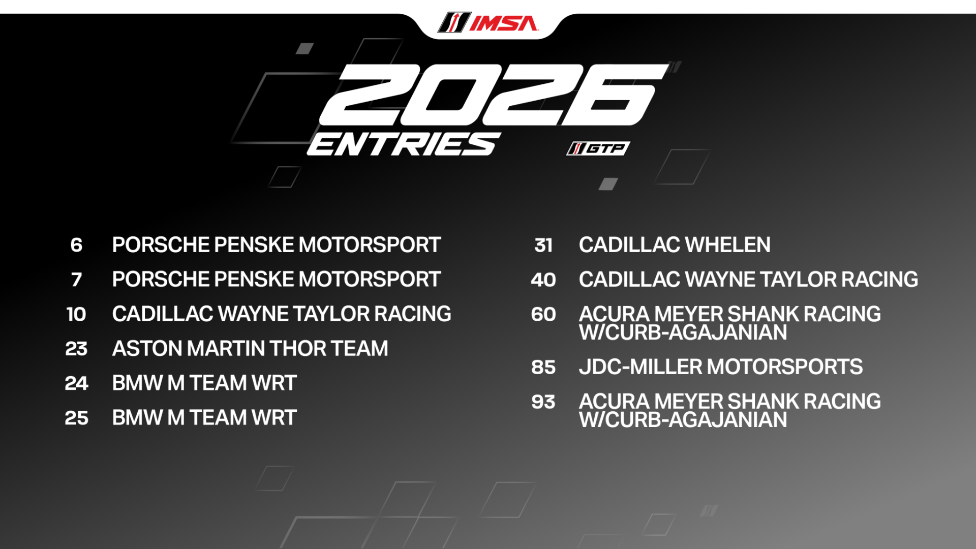 “Once again, the quality and quantity of cars and teams is on display for the 2026 IMSA WeatherTech SportsCar Championship season,” said IMSA President John Doonan. “All of our GTP, LMP2, GTD PRO and GTD classes are highly represented. We know teams have a choice of where to race, and we’re thankful they continue to race in IMSA to provide the best possible sports car racing for our fans.”
