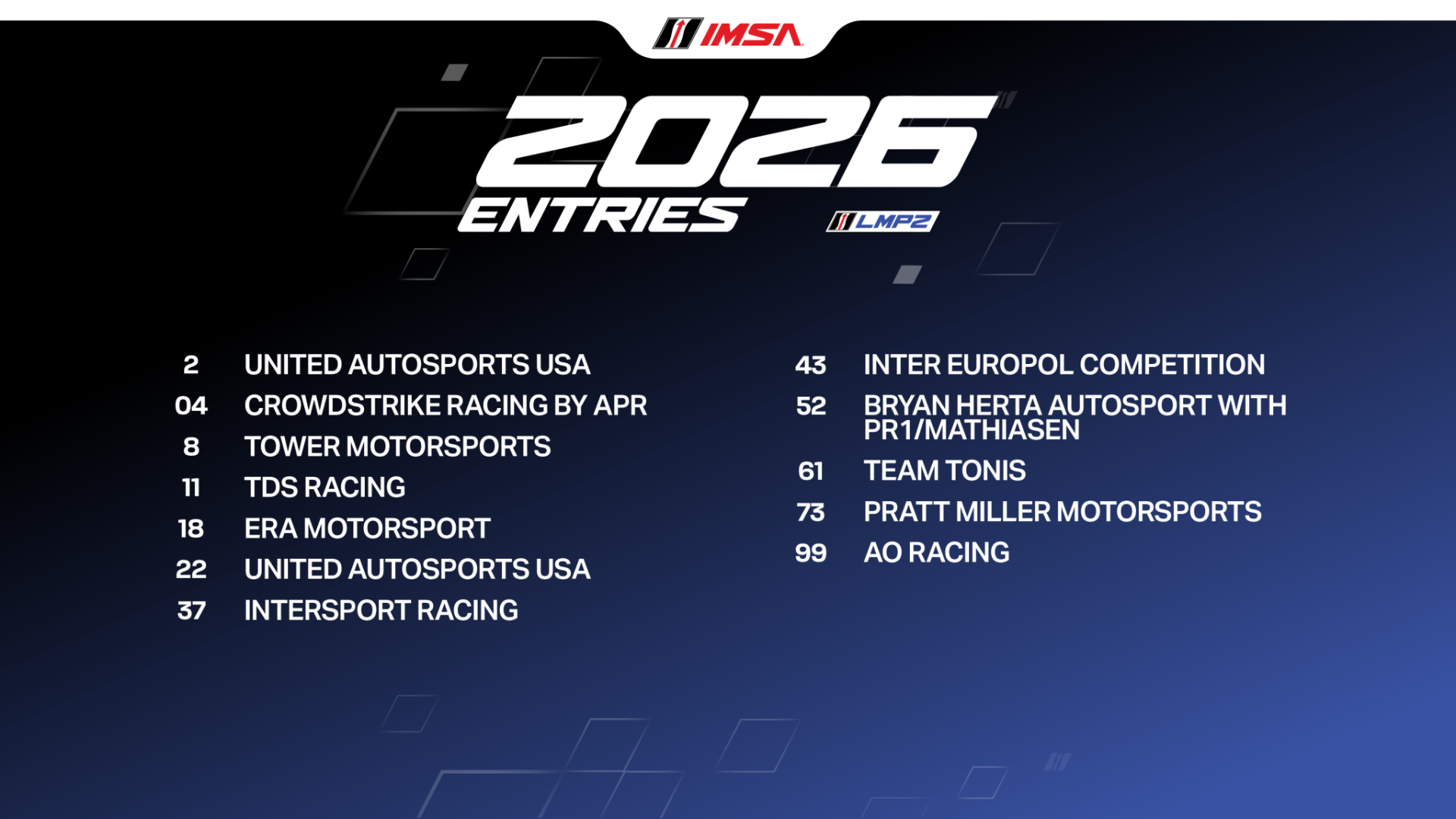 The LMP2 field remains strong with 12 full-season cars split among 11 teams. While United Autosports USA fields two cars, single entries come from CrowdStrike Racing by APR, Tower Motorsports, TDS Racing, Era Motorsport, Intersport Racing, Inter Europol Competition, Bryan Herta Autosport with PR1/Mathiasen, Team Tonis, Pratt Miller Motorsports and AO Racing.
