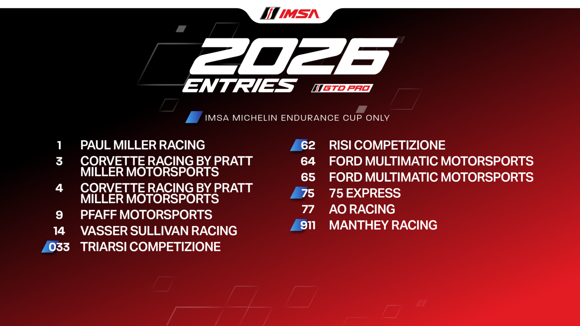 Corvette Racing by Pratt Miller Motorsports and Ford Multimatic Motorsports continue with two-car full-season efforts, joined by single entries apiece from Paul Miller Racing, Pfaff Motorsports, Vasser Sullivan Racing and AO Racing. Confirmed Michelin Endurance Cup entries come from Triarsi Competizione, Risi Competizione, 75 Express and Manthey Racing.