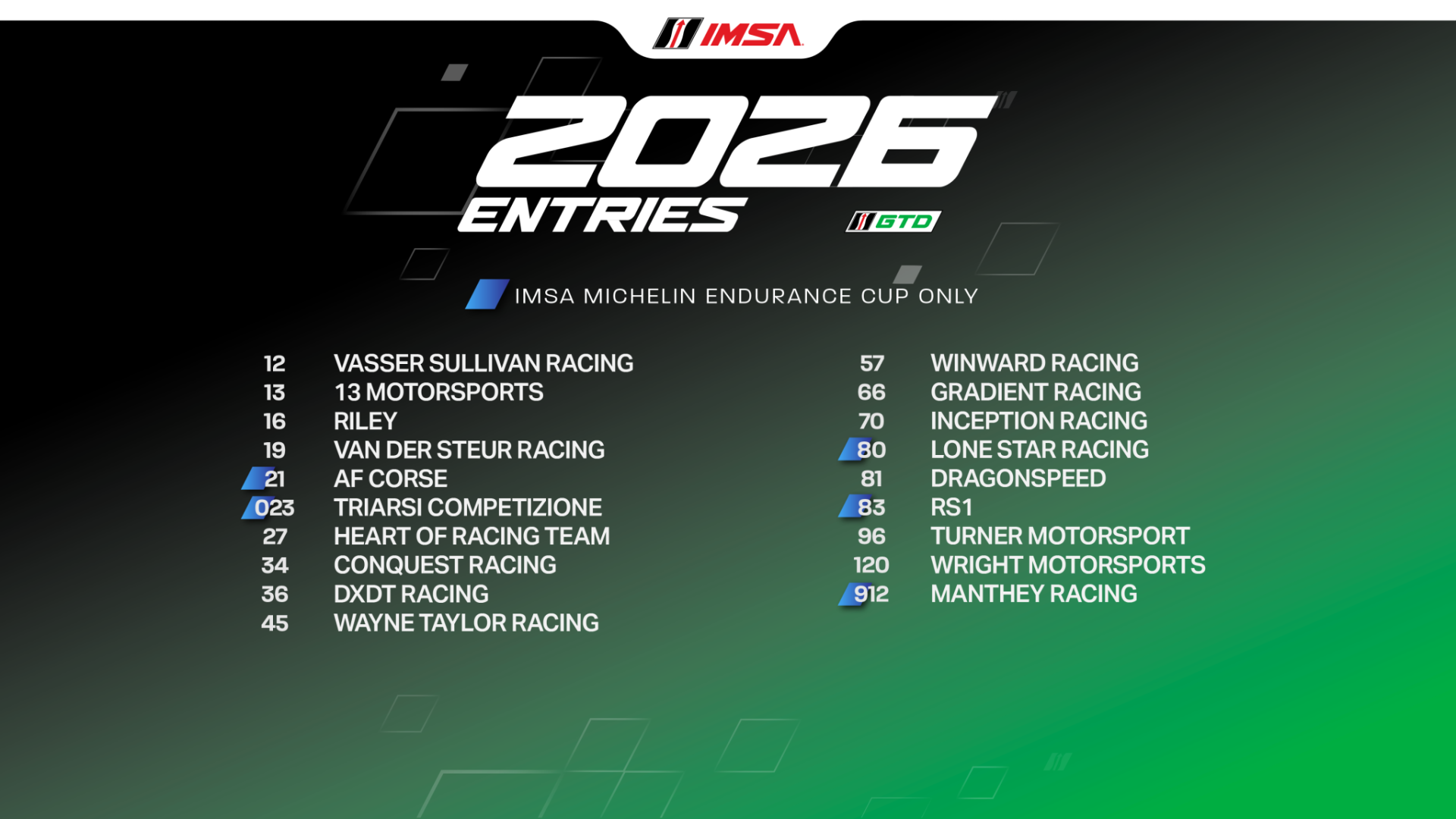 The 14 full-season entries come from 14 teams: Vasser Sullivan Racing, 13 Motorsports, Riley, van der Steur Racing, Heart of Racing Team, Conquest Racing, DXDT Racing, Wayne Taylor Racing, Winward Racing, Gradient Racing, Inception Racing, DragonSpeed, Turner Motorsport and Wright Motorsports.